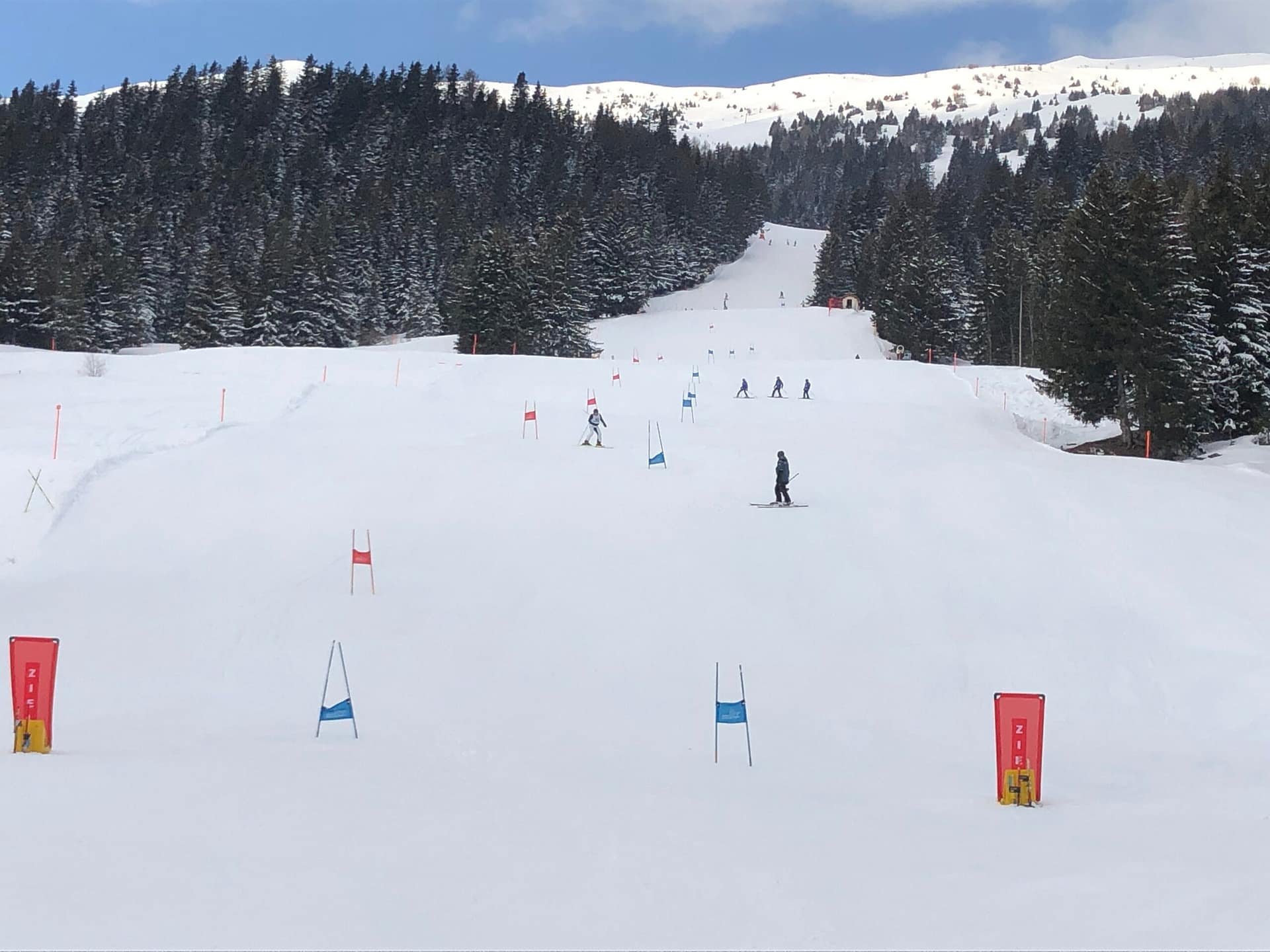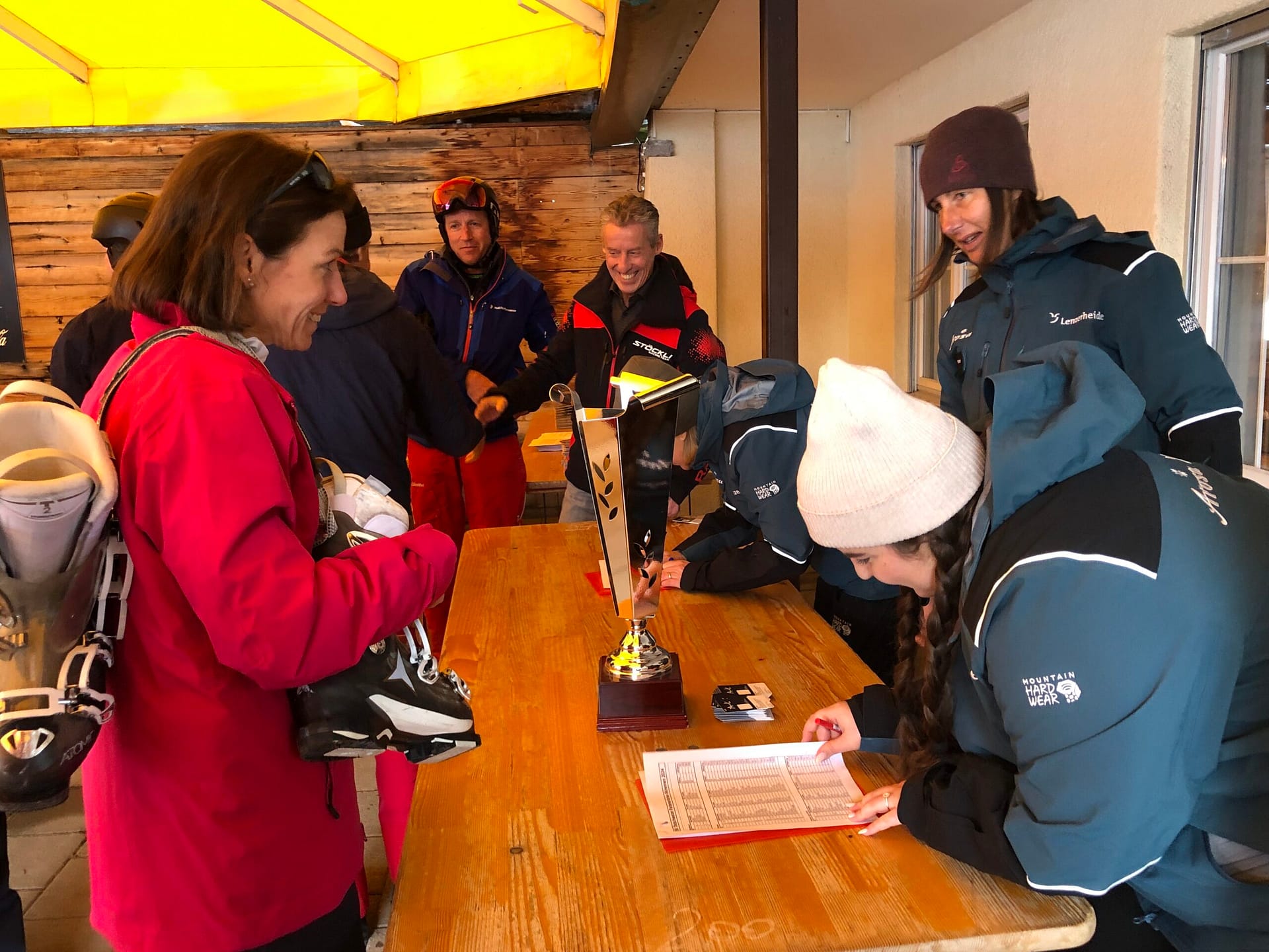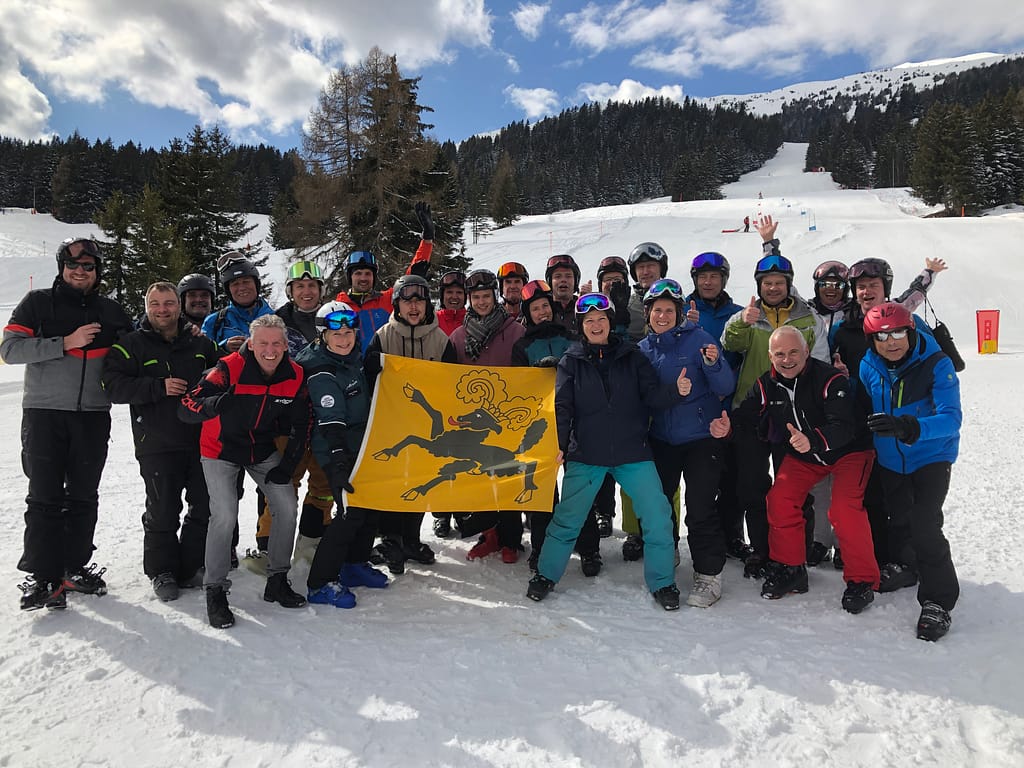 Mit der ganzen Truppe ging es dann den Berg hoch. Nach einem kurzen Warmfahren standen die tollkühnen Fahrerinnen und Fahrer auch schon am Start bereit. Das Rennen bestand aus zwei Läufen, deren Zeit am Ende zusammengerechnet wurde. Insgesamt wurde in vier Kategorien gefahren: Snowboard, Damen Ski, Herren 1 Ski und Herren 2 Ski. Die Piste hatte es in sich und trennte fahrerisch die Spreu vom Weizen, was sogar zu Verletzungen führte. Bis in die Anfänge des Nachmittags dauerte das Rennen. Als alle wieder im Ziel angekommen waren, gab es noch auf der Piste einen kleinen Vesper. Gestärkt und im Hotel frisch gemacht waren dann die Teilnehmerinnen und Teilnehmer bereit für die grosse Rangverkündigung am Abend.