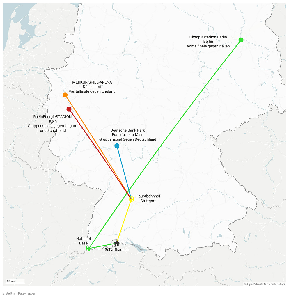 Um die Kosten möglichst tief zu halten, habe ich den Grossteil der Reisen mit dem Zug absolviert. Da die Spiele der Schweizer Nati in ganz Deutschland (Köln, Frankfurt, Berlin und Düsseldorf) verteilt waren und ich zwischen den Spielen wieder zurück nach Schaffhausen musste, sass ich über 50 Stunden in den Zugabteilen.